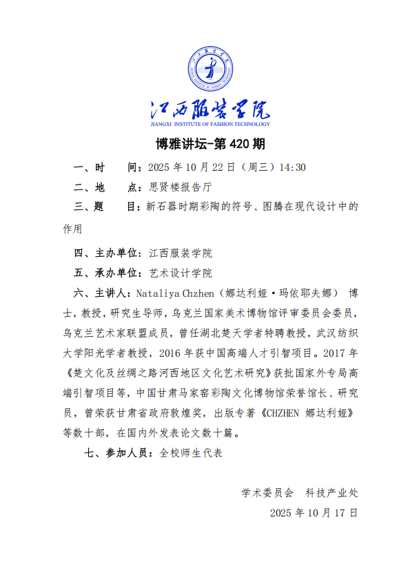 【来源:关于举办江西服装学院博雅讲坛(第420期)的通知 | 发布日期:2025-10-17 】
