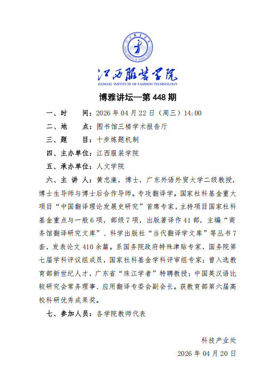 【来源:关于举办江西服装学院博雅讲坛(第448期)的通知 | 发布日期:2026-04-20 】